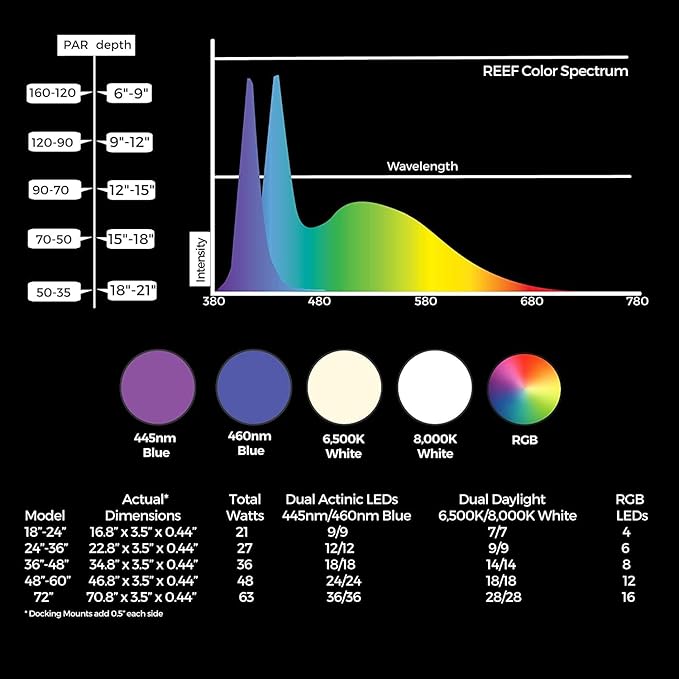 - EYE POPPING COLORS -A powerful blend of Dual Actinic blue 445nm/460nm, Dual Daylight white 6,700K/10,000K and RGB LEDs combined with 90¡ spherical optical lenses delivers the perfect blend of light for strong coral growth and amazing fluorescence.