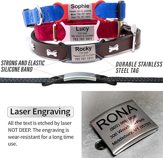 - 🐈 Laser Engraved Pet ID Tags: Rest assured, the laser engraved, clear text on your personalized dog collar tag or personalized cat collar tag will look great and will not fade. Attach your engraved pet tag to your pet's collar or harness.