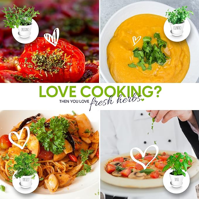 - Equipment & Accessories - This kit includes everything with nothing else to buy. You get 8 pots, 8 saucers to collect runoff, 8 expanding soil discs, and 1 kelp nutrition pack. We also include 8 transparent herb labels so you always know which pot holds which plant. Labels are printed in charming large Rae Dunn font to take the place of the usual stakes. These will look cute in your kitchen.