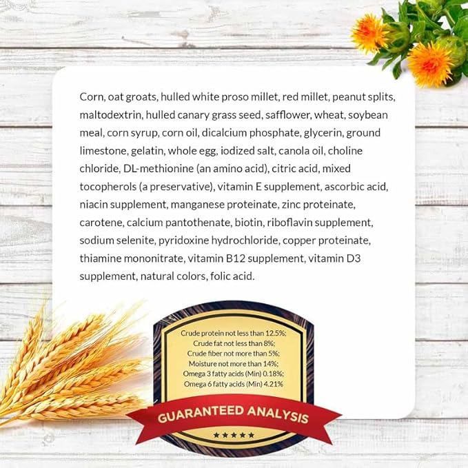 - Balanced omega 3 and 6 fatty acids to promote skin and feather health