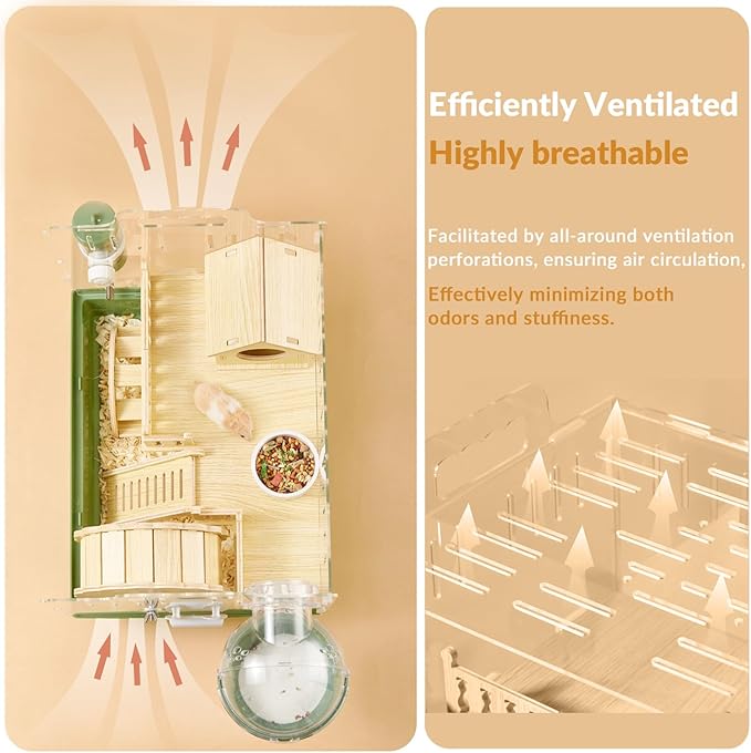 - 【See-through & Breathable】Peeling off the protective films on both acrylic sides ensures crystal-clear transparency for 24/7 hamster observation, while three-sided ventilation with <5mm micro-holes provides optimal airflow without escape risks.