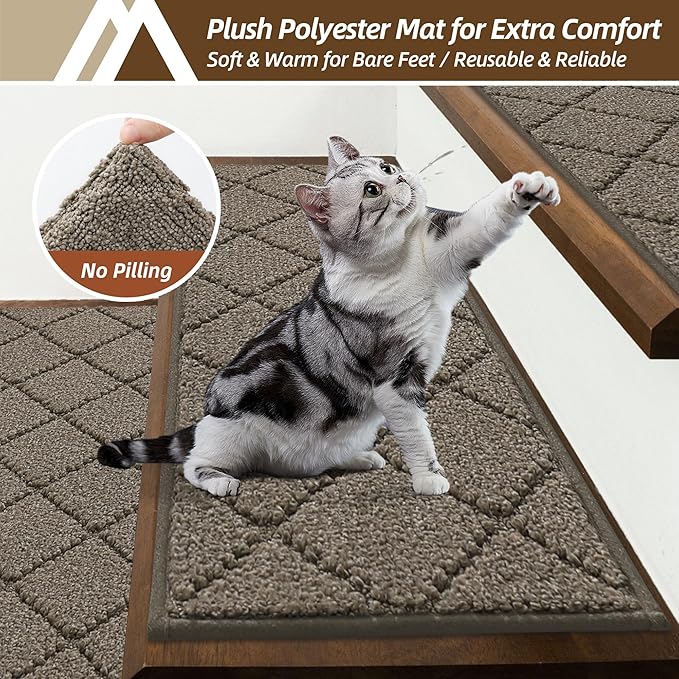 COSY HOMEER Stair Treads for Wooden Steps 9"x28" Washable Indoor Carpet Stair Treads Non Slip Soft Polyester Stair Carpet Tread Reusable Stair Runner Rugs for Kids, Elders,Pets,Light Brown,10pcs