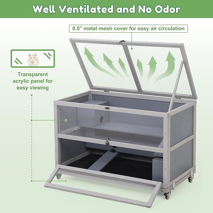 - Well-Ventilated Habitat: The 0.5" wire mesh top ensures optimal airflow to minimize odors and humidity, creating a fresher, healthier environment for hamsters, guinea pigs, hedgehogs, dwarf hamster and other small pets.