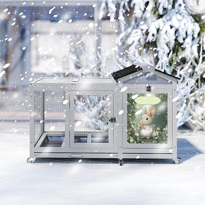 - Top Solar Panels&Asphalt:The top of the rabbit cage indoor is divided into two parts, the left part can be used for eating and playing, the top is made of sunlight panels, you can also enjoy the sunshine, the right side of the rabbit house outdoor is a resting area, the spire constructs a comfortable room